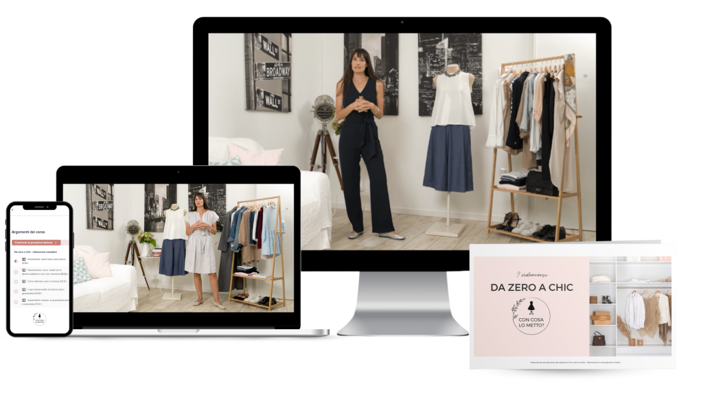 Nel 2022 Angela ha lanciato il suo videocorso “Da zero a chic” con cui guida le persone a crearsi un armadio “che funziona”: economico, sostenibile, pratico.